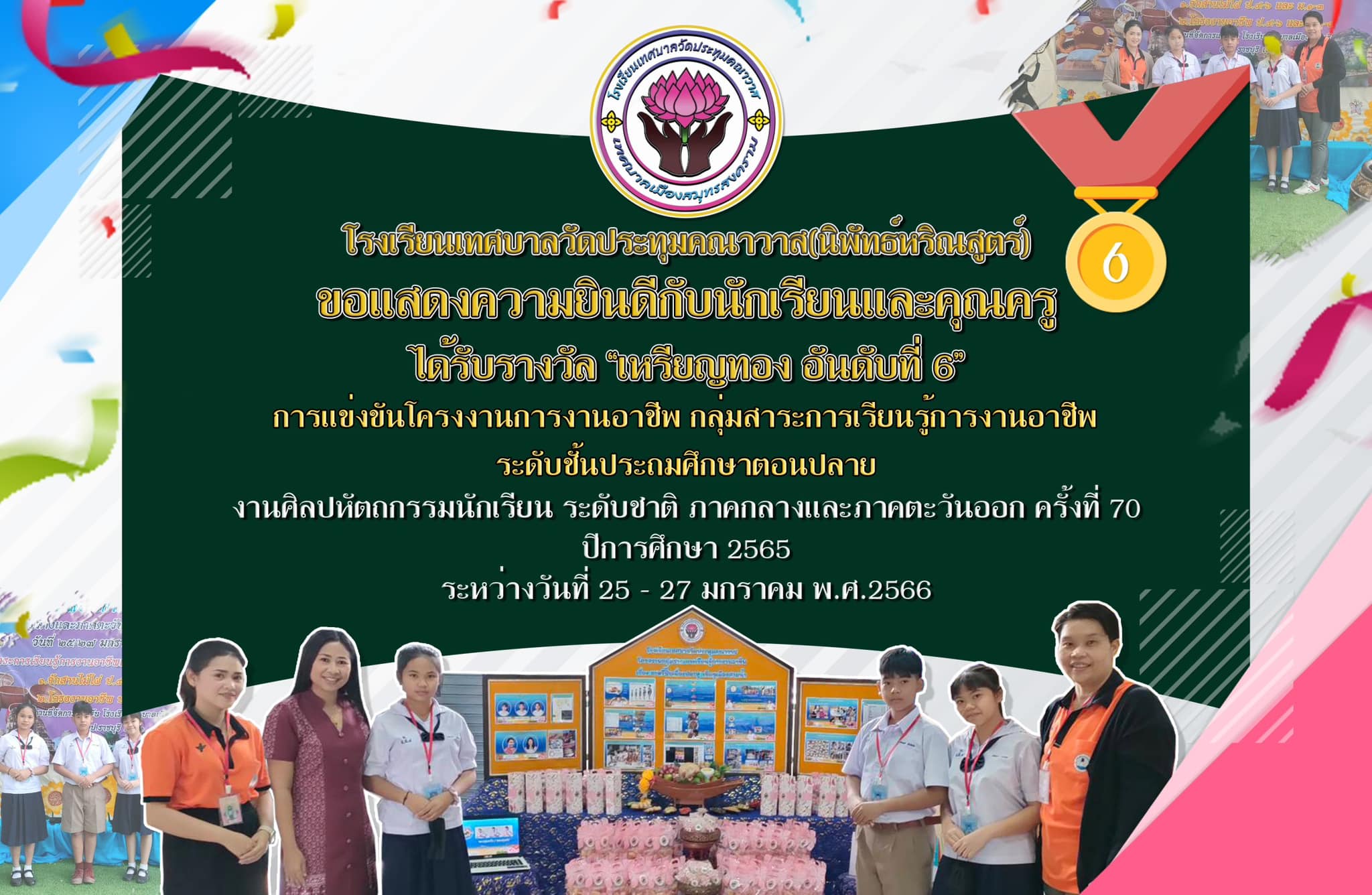 โรงเรียนเทศบาลวัดประทุมคณาวาส(นิพัทธ์หริณสูตร์) ขอแสดงความยินดีกับนักเรียนและคุณครูในโอกาสได้รับรางวัลเหรียญทอง อันดับที่ 6 การประกวดแข่งขันโครงงานการงานอาชีพ ระดับชั้นประถมศึกษาตอนปลาย กลุ่มสาระการเรียนรู้การงานอาชีพ