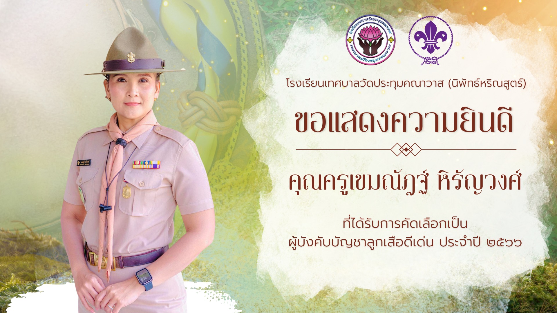 :: ขอแสดงความยินดีกับคุณครูที่ได้รับการคัดเลือกเป็น ”ผู้บังคับบัญชาลูกเสือดีเด่น” ประจำปี ๒๕๖๖ 💐 :: ข่าวประชาสัมพันธ์โรงเรียน November 22, 2023 admin โรงเรียนเทศบาลวัดประทุมคณาวาส(นิพัทธ์หริณสูตร์) ขอแสดงความยินดีกับ คุณครูเขมณัฎฐ์ หิรัญวงศ์ ที่ได้รับการคัดเลือกเป็น ”ผู้บังคับบัญชาลูกเสือดีเด่น” ประจำปี ๒๕๖๖