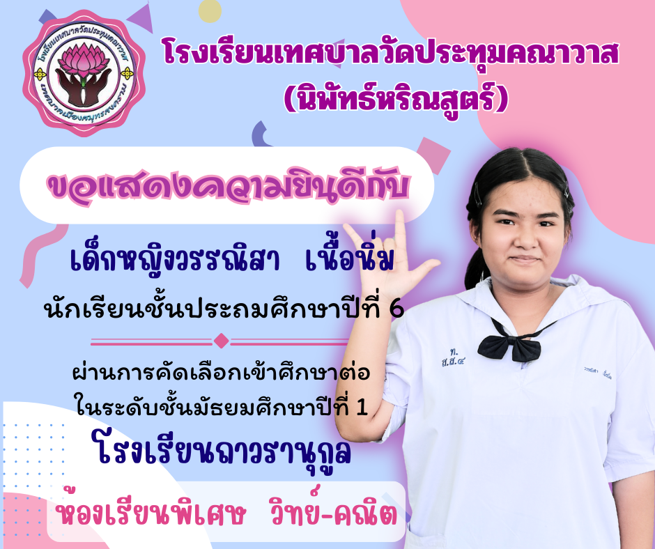 นักเรียนโรงเรียนเทศบาลวัดประทุมคณาวาส (นิพัทธ์หริณสูตร์) ระดับชั้นประถมศึกษาปีที่ 6 ที่สามารถสอบเข้า ห้องเรียนพิเศษ วิทย์-คณิต สู่รั้ว แดง❤️ขาว🤍โรงเรียนถาวรานุกูล และห้องเรียนพิเศษ AP สู่รั้ว น้ำเงิน💙 เหลือง💛โรงเรียนศรัทธาสมุทร