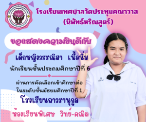 • Previous :: ขอแสดงความยินดีกับนักเรียนระดับชั้นประถมศึกษาปีที่ 6 ที่สามารถสอบเข้าห้องเรียนพิเศษ วิทย์-คณิต และห้องเรียนพิเศษ AP ::