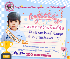 :: ขอแสดงความยินดีกับ ” นักเรียนระดับชั้นประถมศึกษาปีที่ 1 ” ที่มีผลการประเมินความสามารถด้านการอ่านของผู้เรียน (Reading Test : RT) 100 คะแนนเต็ม ::