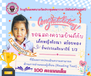 :: ขอแสดงความยินดีกับ ” นักเรียนระดับชั้นประถมศึกษาปีที่ 1 ” ที่มีผลการประเมินความสามารถด้านการอ่านของผู้เรียน (Reading Test : RT) 100 คะแนนเต็ม ::