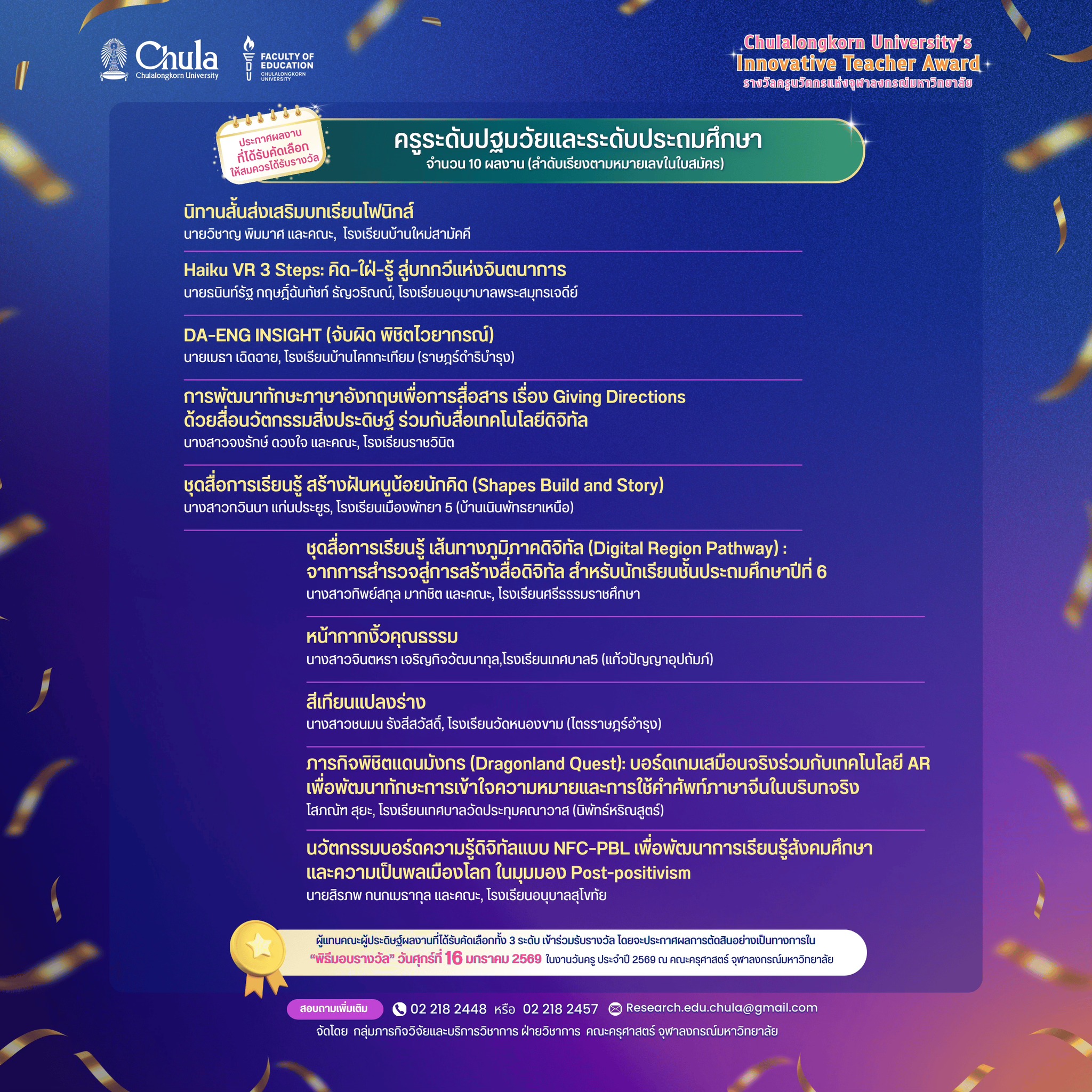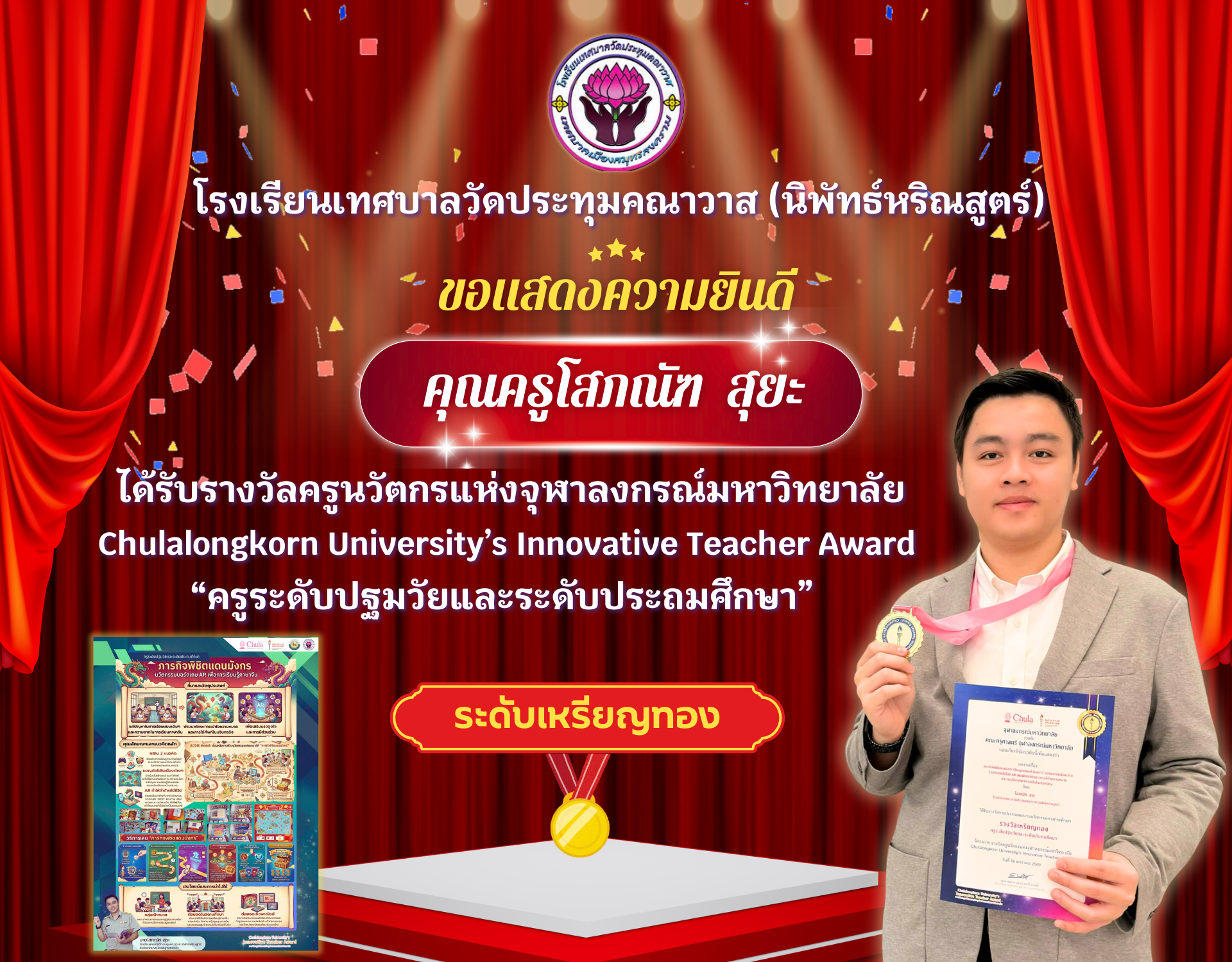 ✨โรงเรียนเทศบาลวัดประทุมคณาวาส (นิพัทธ์หริณสูตร์) ขอแสดงความยินดีกับ 🎉คุณครูโสภณัฑ สุยะ ได้รับรางวัลครูนวัตกรแห่งจุฬาลงกรณ์มหาวิทยาลัย : Chulalongkorn University’s Innovative Teacher Award “ครูระดับปฐมวัยและระดับประถมศึกษา” ✨ระดับเหรียญทอง🏅✨ ในงานวันครู ประจำปี 2569 ณ คณะครุศาสตร์ จุฬาลงกรณ์มหาวิทยาลัย