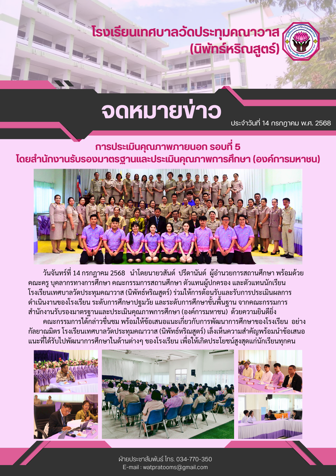 วันจันทร์ที่ 14 กรกฎาคม 2568 นำโดยนายวสันต์ ปรีดานันต์ ผู้อำนวยการสถานศึกษา พร้อมด้วยคณะครู บุคลากรทางการศึกษา คณะกรรมการสถานศึกษา ตัวแทนผู้ปกครอง และตัวแทนนักเรียนโรงเรียนเทศบาลวัดประทุมคณาวาส (นิพัทธ์หริณสูตร์) ร่วมให้การต้อนรับและรับการประเมินผลการดำเนินงานของโรงเรียน ระดับการศึกษาปฐมวัย และระดับการศึกษาขั้นพื้นฐาน จากคณะกรรมการ สำนักงานรับรองมาตรฐานและประเมินคุณภาพการศึกษา (องค์การมหาชน) ด้วยความยินดียิ่ง