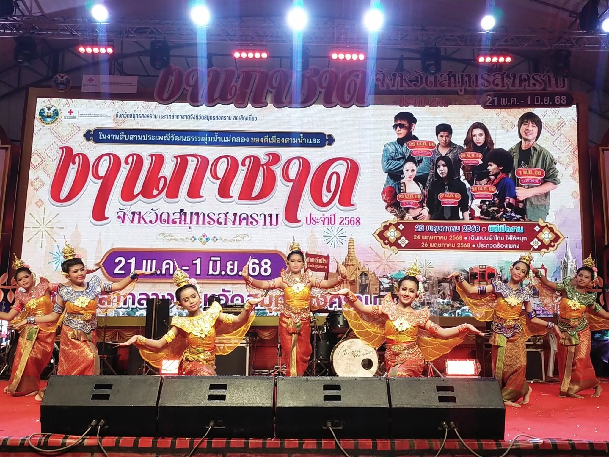 นักเรียนชุมนุมนาฏศิลป์ โรงเรียนเทศบาลวัดประทุมคณาวาส (นิพัทธ์หริณสูตร์) ทำการแสดง “ระบำไกรลาสสำเริง” ในงานสืบสานประเพณีวัฒนธรรมลุ่มน้ำแม่กลองของดีเมืองสามน้ำ และงานกาชาดจังหวัดสมุทรสงคราม ประจำปี 2568 ณ เวทีกลาง บริเวณศาลากลางจังหวัดสมุทรสงคราม