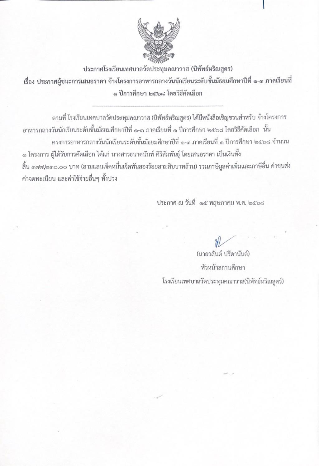 :: ประกาศผู้ชนะการเสนอราคา จ้างโครงการอาหารกลางวันนักเรียนระดับมัธยมศึกษาปีที่ 1-3 ภาคเรียนที่ 1 ปีการศึกษา 2568 โดยวิธีการคัดเลือก ::