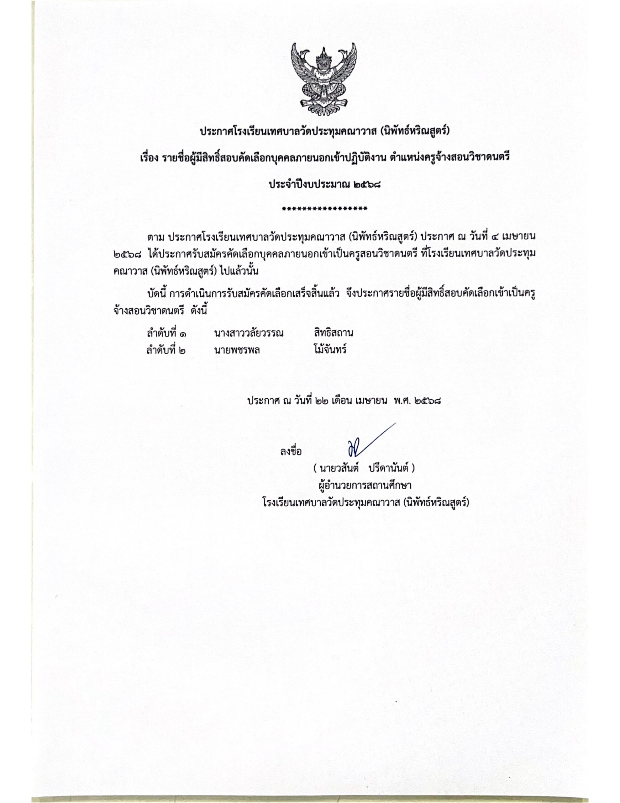 ประกาศรายชื่อผู้มีสิทธิ์สอบคัดเลือกบุคคลภายนอกเข้าปฏิบัติงาน ตำแหน่งครูจ้างสอนวิชาดนตรี ประจำปีงบประมาณ พ.ศ.2568
