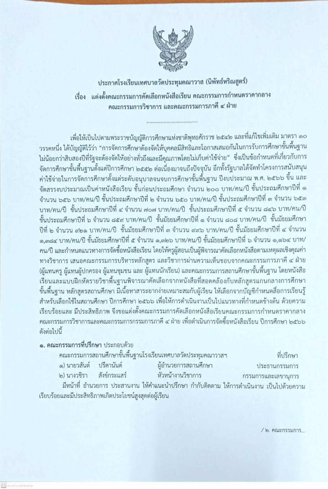 ประกาศโรงเรียนเทศบาลวัดประทุมคณาวาส (นิพัทธ์หริณสูตร์) เรื่อง แต่งตั้งคณะกรรมการคัดเลือกหนังสือเรียน คณะกรรมการกำหนดราคากลาง คณะกรรมการวิชาการ และคณะกรรมการภาคี ๔ ฝ่าย