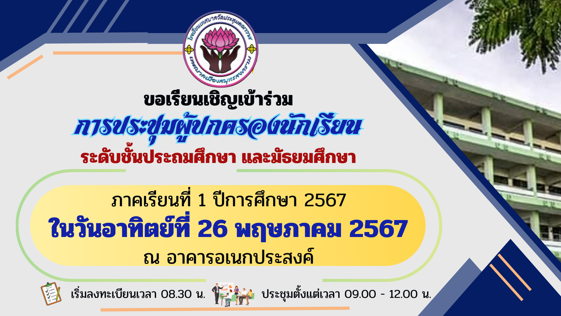 ประชาสัมพันธ์กำหนดการประชุมผู้ปกครอง ภาคเรียนที่ 1 ปีการศึกษา 2567 ระดับชั้นประถมศึกษาปีที่ 1-6 และมัธยมศึกษาปีที่ 1-6 ในวันอาทิตย์ที่ 26 พฤษภาคม 2567 ณ อาคารอเนกประสงค์