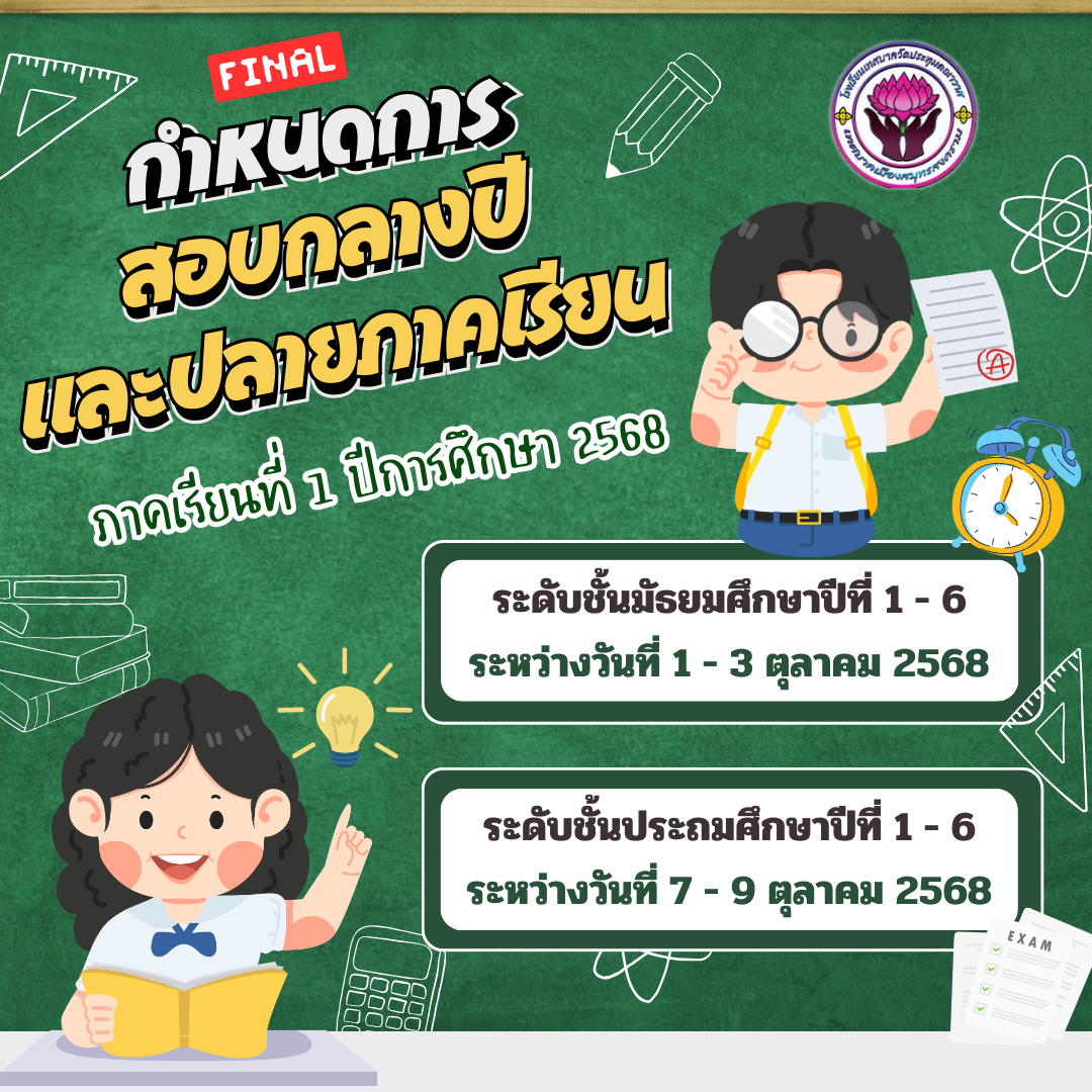 :: ประชาสัมพันธ์กำหนดการสอบ ประจำภาคเรียนที่ 1 ปีการศึกษา 2568 :: ข่าวประชาสัมพันธ์โรงเรียน September 11, 2025 admin 📢ประชาสัมพันธ์กำหนดการสอบ ประจำภาคเรียนที่ 1 ปีการศึกษา 2568 📌ระดับชั้นประถมศึกษาปีที่ 1-6 ระหว่างวันที่ 7 – 9 ตุลาคม 2568 📌ระดับชั้นมัธยมศึกษาปีที่ 1-6 ระหว่างวันที่ 1 – 3 ตุลาคม 2568