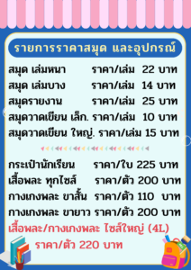 • Previous :: ประชาสัมพันธ์ช่วงเวลาเปิดจำหน่ายสมุด อุปกรณ์การเรียน กระเป๋า และชุดพละ ::