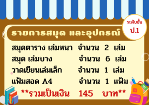 :: ประชาสัมพันธ์ช่วงเวลาเปิดจำหน่ายสมุด อุปกรณ์การเรียน กระเป๋า และชุดพละ ::