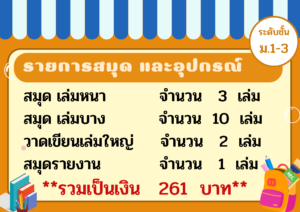 • Previous :: ประชาสัมพันธ์ช่วงเวลาเปิดจำหน่ายสมุด อุปกรณ์การเรียน กระเป๋า และชุดพละ ::
