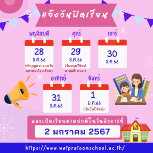 • Previous :: ประชาสัมพันธ์วันปิดเรียนช่วงเทศกาลวันปีใหม่ ::