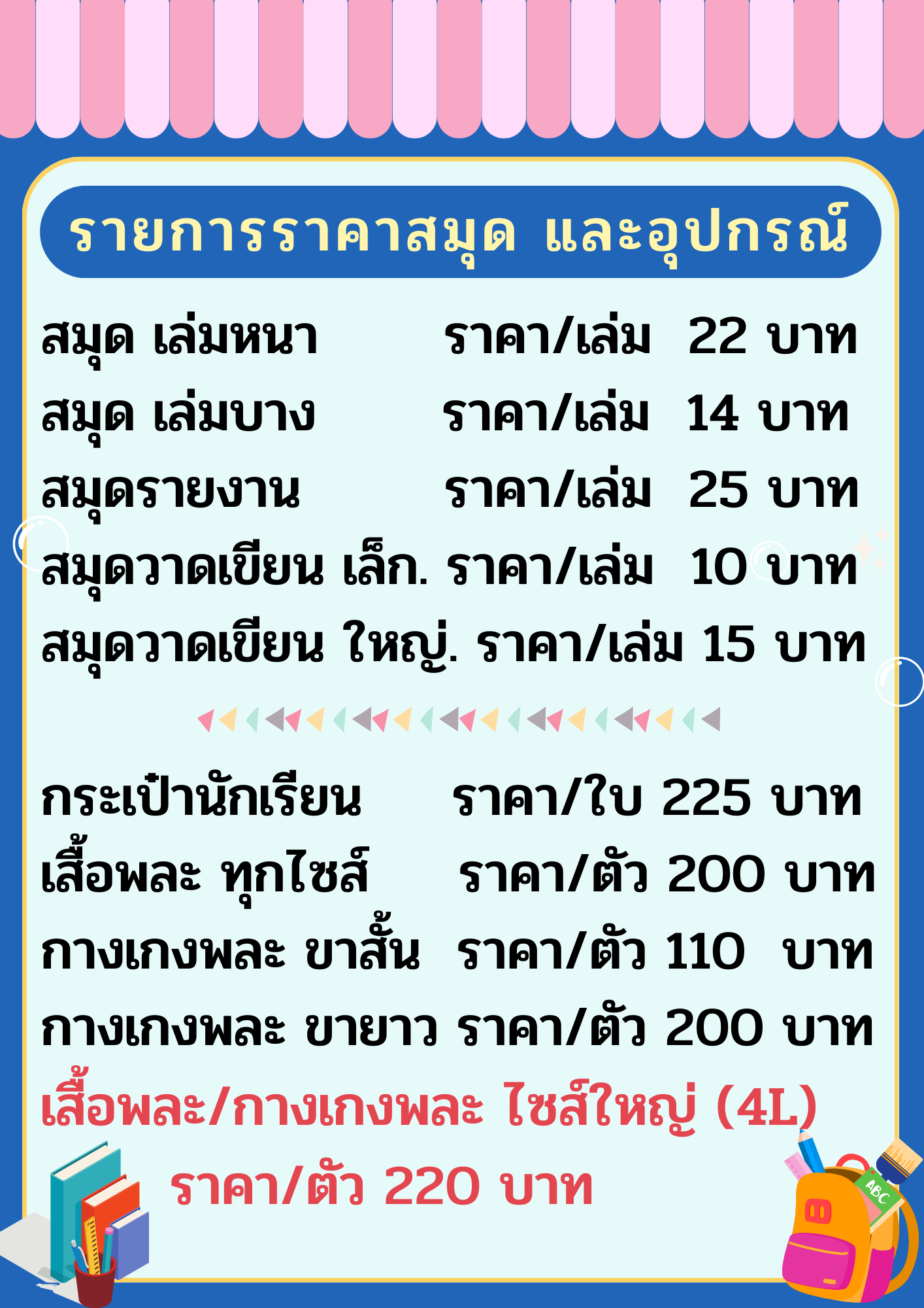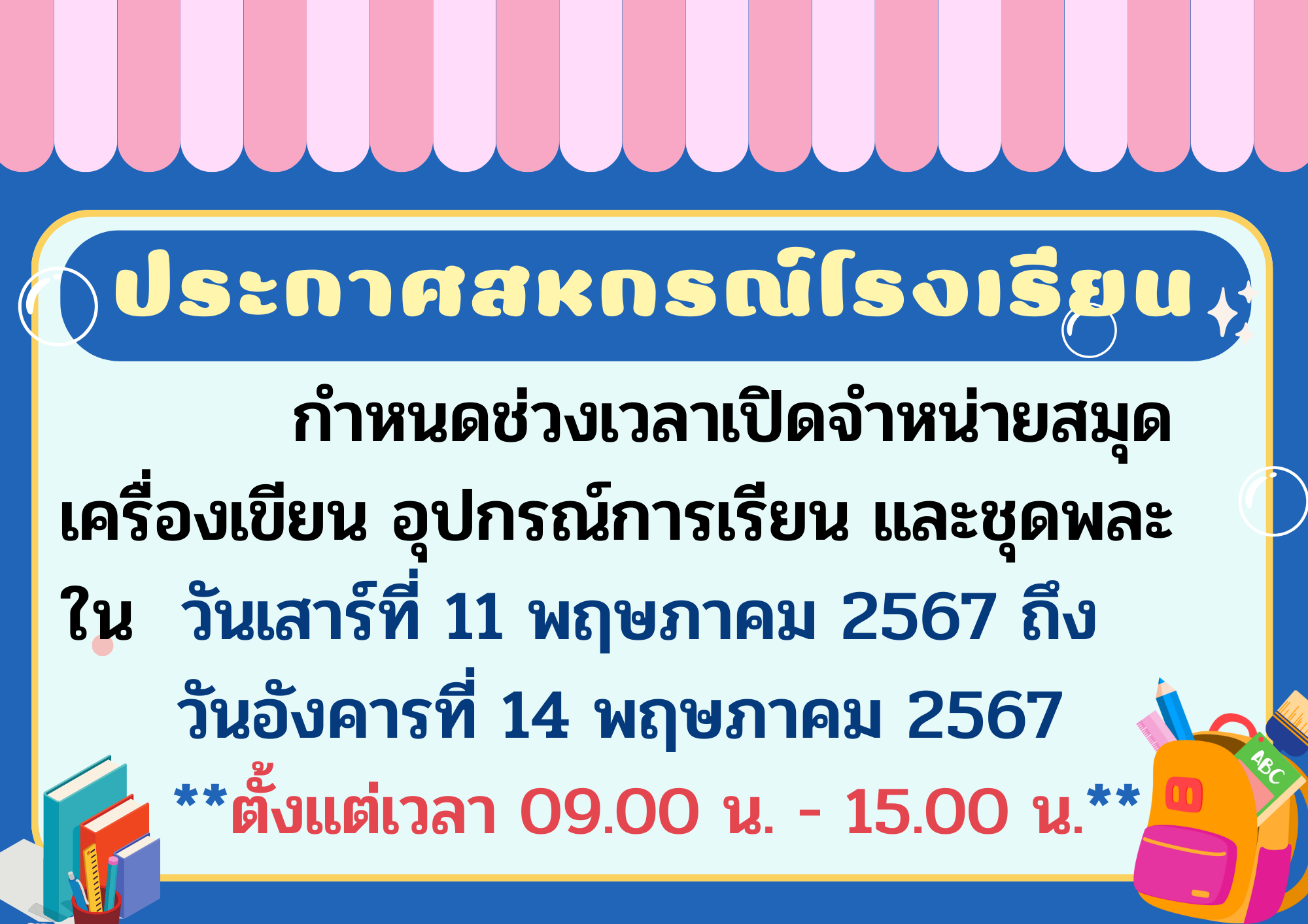 :: ประชาสัมพันธ์สหกรณ์โรงเรียน กำหนดช่วงวันและเวลาเปิดจำหน่ายสมุด เครื่องเขียน อุปกรณ์การเรียน และชุดพละ :: ข่าวประชาสัมพันธ์โรงเรียน March 13, 2024 admin ประชาสัมพันธ์สหกรณ์โรงเรียน กำหนดช่วงวันและเวลาเปิดจำหน่ายสมุด เครื่องเขียน อุปกรณ์การเรียน และชุดพละ ในวันเสาร์ที่ 11 พฤษภาคม 2567 ถึงวันอังคารที่ 14 พฤษภาคม 2567 ทั้งนี้ **ตั้งแต่เวลา 09.00 น. – 15.00 น.** โดยมีรายละเอียดของแต่ละระดับชั้นดังภาพ