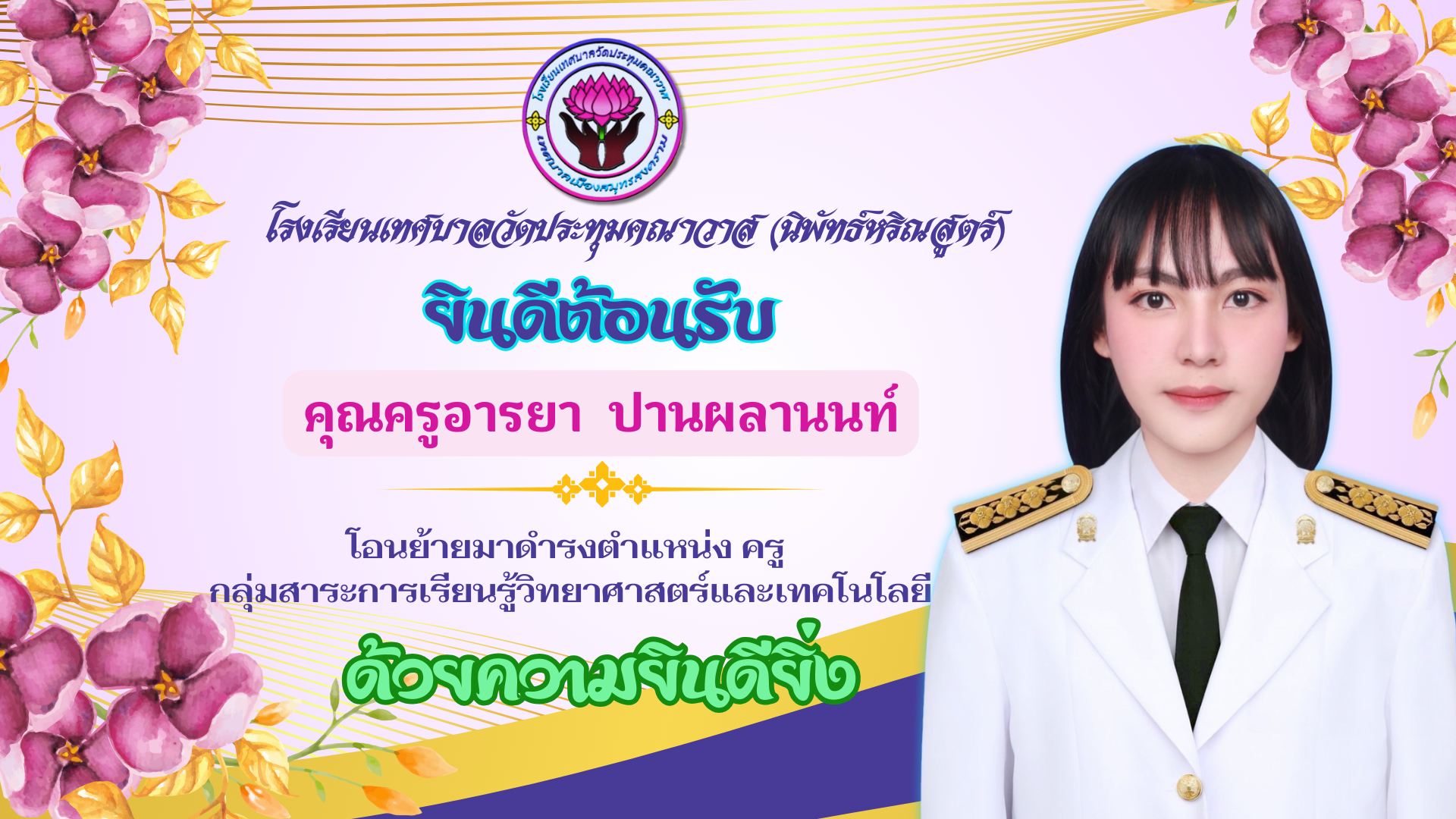 :: ยินดีต้อนรับ คุณครูอารยา ปานผลานนท์ โอนย้ายมาดำรงตำแหน่งครู :: ข่าวประชาสัมพันธ์โรงเรียน / ประกาศโรงเรียน April 2, 2025 admin โรงเรียนเทศบาลวัดประทุมคณาวาส (นิพัทธ์หริณสูตร์) ยินดีต้อนรับ คุณครูอารยา ปานผลานนท์ โอนย้ายมาดำรงตำแหน่ง ครู กลุ่มสาระการเรียนรู้วิทยาศาสตร์และเทคโนโลยี ด้วยความยินดียิ่ง