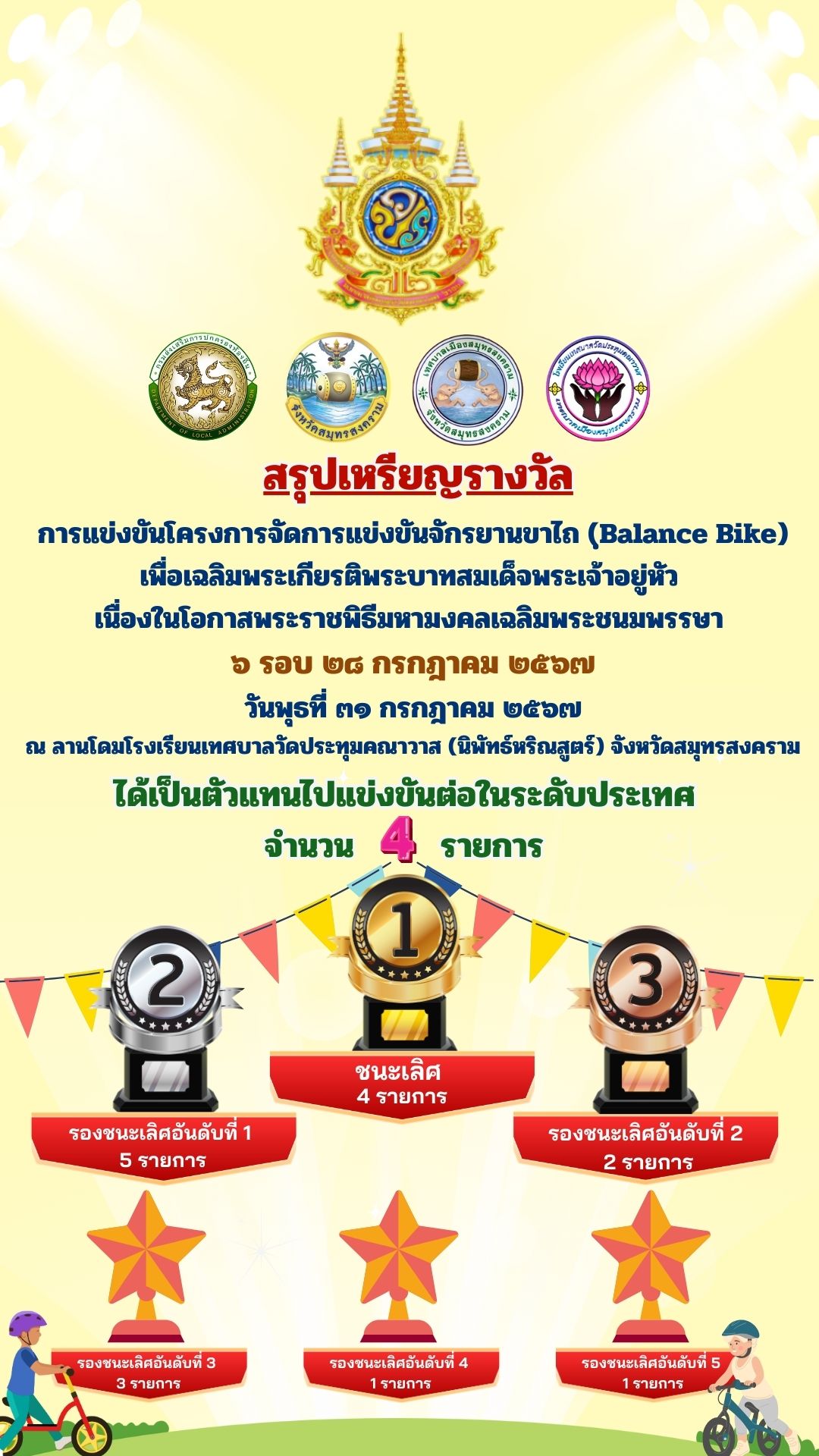 #สรุปผลการแข่งขันโครงการจัดการแข่งขันจักรยานขาไถ (ฺBalance Bike) เพื่อเฉลิมพระเกียรติพระบาทสมเด็จพระเจ้าอยู่หัว เนื่องในโอกาสพระราชพิธีมหามงคลเฉลิมพระชนมพรรษา 6 รอบ 28 กรกฎาคม 2567 วันพุธที่ 31 กรกฎาคม 2567 ณ ลานโดมโรงเรียนเทศบาลวัดประทุมคณาวาส (นิพัทธ์หริณสูตร์) จังหวัดสมุทรสงคราม