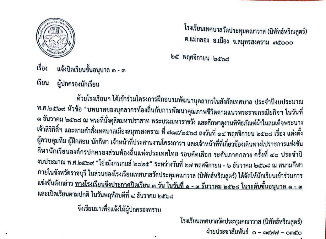 :: แจ้งปิดเรียนนักเรียนระดับชั้นอนุบาล 1-3 ตั้งแต่วันจันทร์ที่ 1 ธันวาคม 2568 ถึงวันพุธที่ 3 ธันวาคม 2568 :: ข่าวประชาสัมพันธ์โรงเรียน / ประกาศโรงเรียน November 26, 2025 admin 📣แจ้งปิดเรียนชั้นอนุบาล 1-3 ทางโรงเรียนขอแจ้งปิดเรียนนักเรียนระดับชั้นอนุบาล 1-3 ตั้งแต่วันจันทร์ที่ 1 ธันวาคม 2568 ถึงวันพุธที่ 3 ธันวาคม 2568 เป็นเวลา 3 วัน และเปิดเรียนตามปกติในวันพฤหัสบดีที่ 4 ธันวาคม 2568 รายละเอียดดังเอกสารแนบ👇👇👇