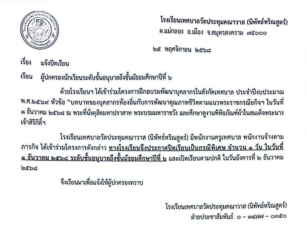 :: แจ้งปิดเรียนนักเรียนระดับชั้นอนุบาลถึงชั้นมัธยมศึกษาปีที่ 6 ในวันจันทร์ที่ 1 ธันวาคม 2568 :: ข่าวประชาสัมพันธ์โรงเรียน / ประกาศโรงเรียน November 26, 2025 admin 📣แจ้งปิดเรียนกรณีพิเศษ ทางโรงเรียนขอแจ้งปิดเรียนนักเรียนระดับชั้นอนุบาลถึงชั้นมัธยมศึกษาปีที่ 6 ในวันจันทร์ที่ 1 ธันวาคม 2568 และเปิดเรียนตามปกติในวันอังคารที่ 2 ธันวาคม 2568 รายละเอียดดังเอกสารแนบ👇👇