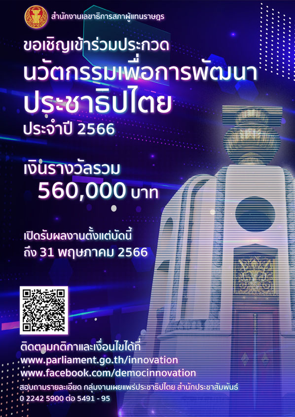 📢ขอเชิญชวนผู้ที่สนใจ เข้าร่วมโครงการประกวดนวัตกรรมประชาธิปไตยเพื่อพัฒนาประชาธิปไตยเชิงคุณภาพ ประจำปี 2566 จัดโดยสำนักงานเลขาธิการสภาผู้แทนราษฎร 💰 ชิงเงินรางวัลรวมกว่า 560,000 บาท ‼️