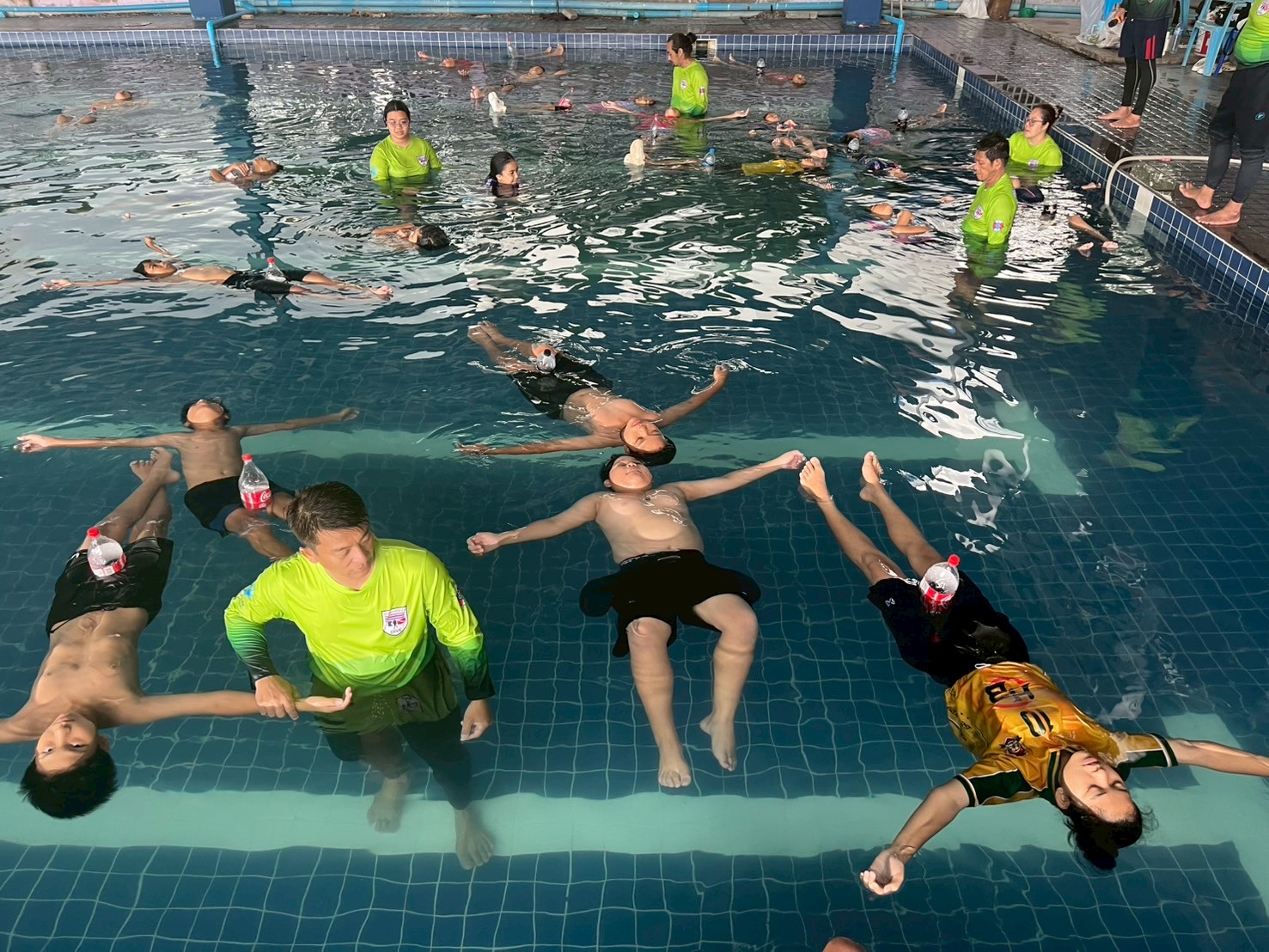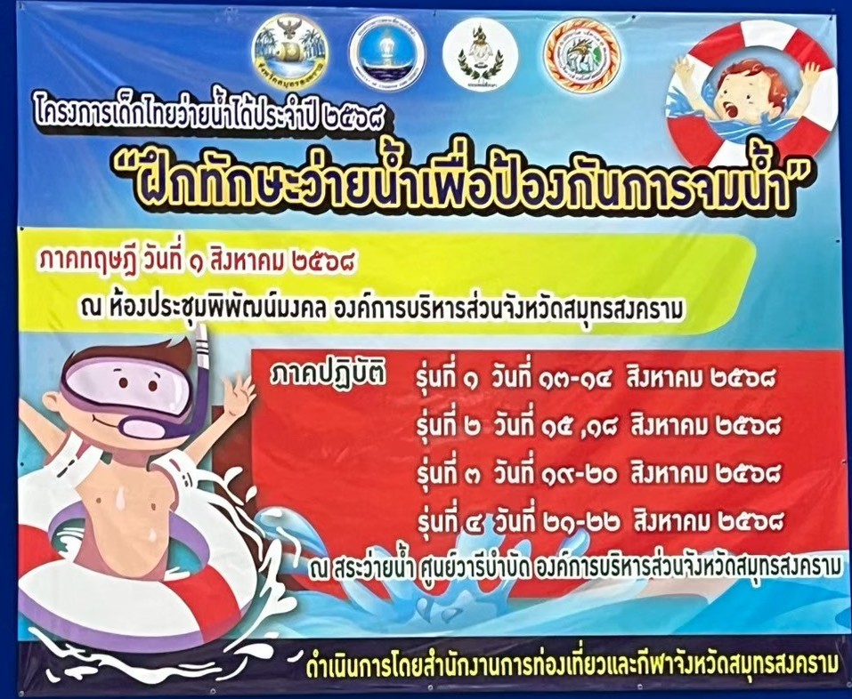นักเรียนระดับชั้นประถมศึกษาปีที่ 6 เข้าร่วมโครงการเด็กไทยว่ายน้ำได้ ประจำปี 2568 “ฝึกทักษะว่ายน้ำเพื่อป้องกันการจมน้ำ” จัดโดยสำนักงานการท่องเที่ยวและกีฬาจังหวัดสมุทรสงคราม ณ ห้องประชุมพิพัฒน์มงคล องค์การบริหารส่วนจังหวัดสมุทรสงคราม